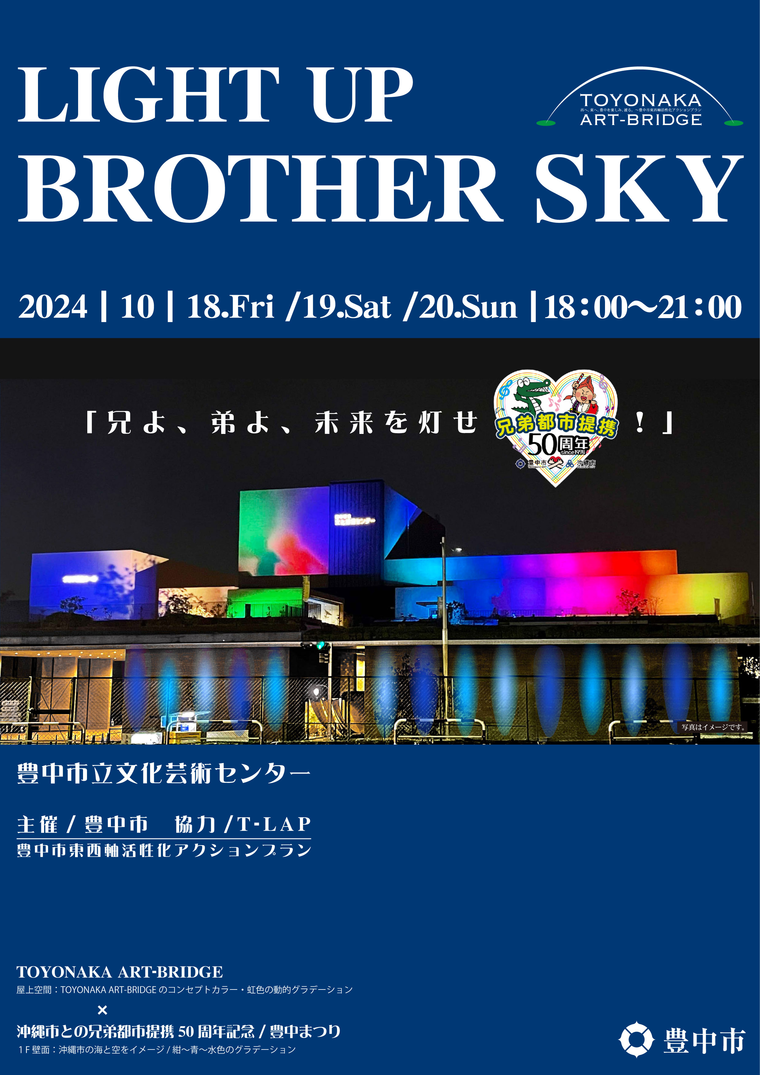 今年は豊中市と沖縄市との「兄弟都市提携50周年記念」をテーマに、ライトアップのスケールを拡大。秋の夜空に届ける、両市の輝きを。