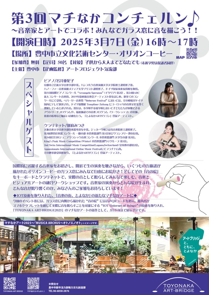 今回のイベント後には、ガラス窓に内側から描かれた“音の絵”には音声QRコードを掲示。鑑賞者がスマホやタブレットを通じて実際に音を鳴らすことを可能にする“IOT(Internet of things)”の技術を取り入れ、「 TOYONAKA ART-BRIDGE2025 」のマチなかアートの新作として、3月下旬まで展示予定です。