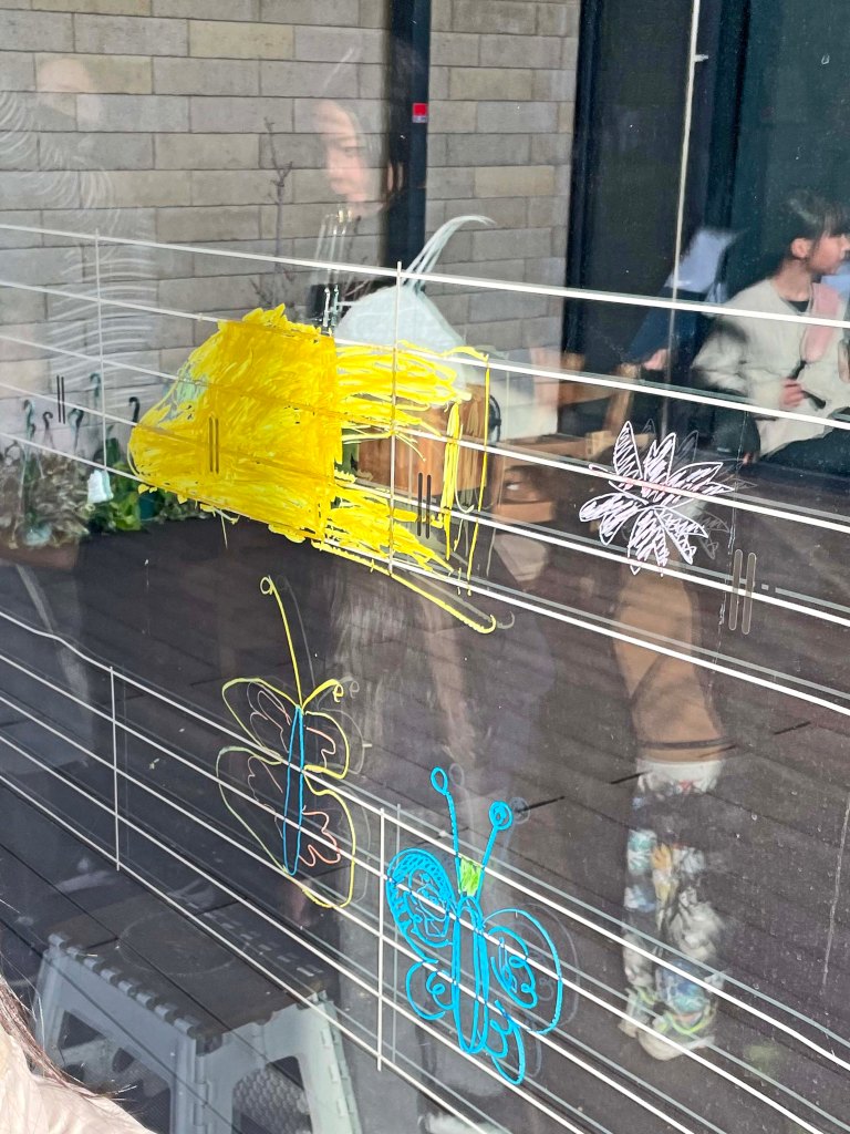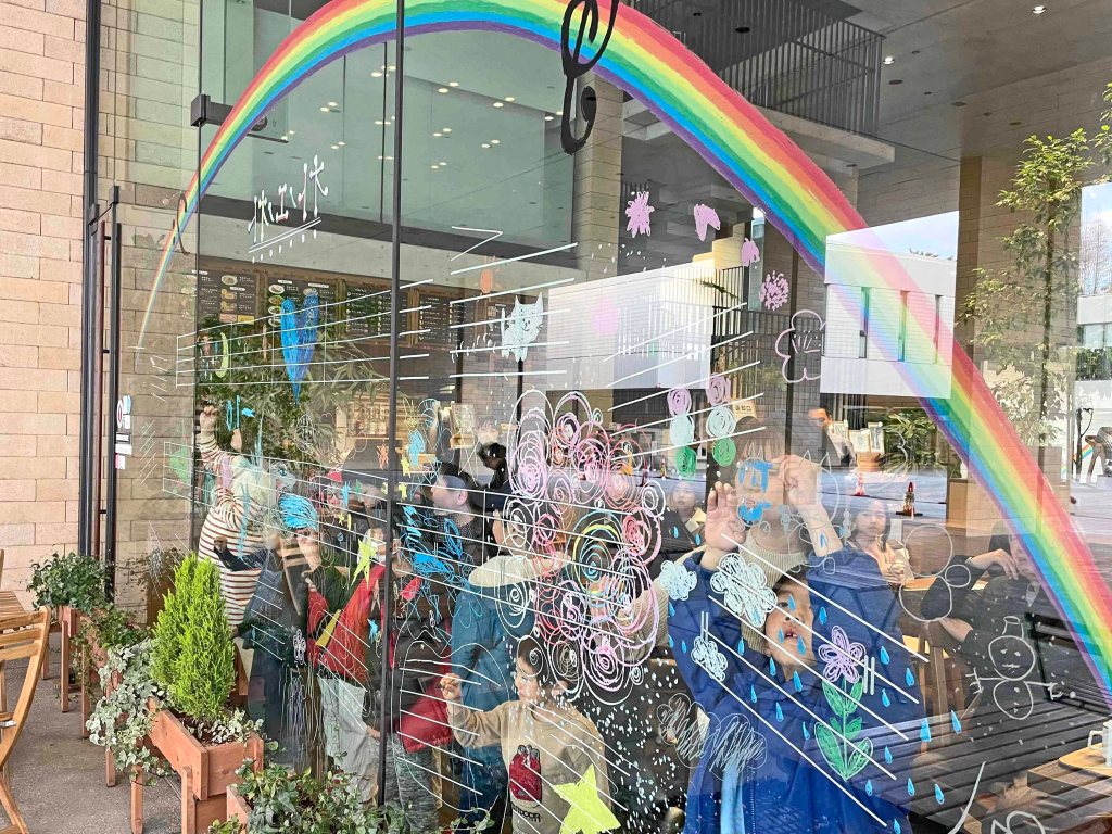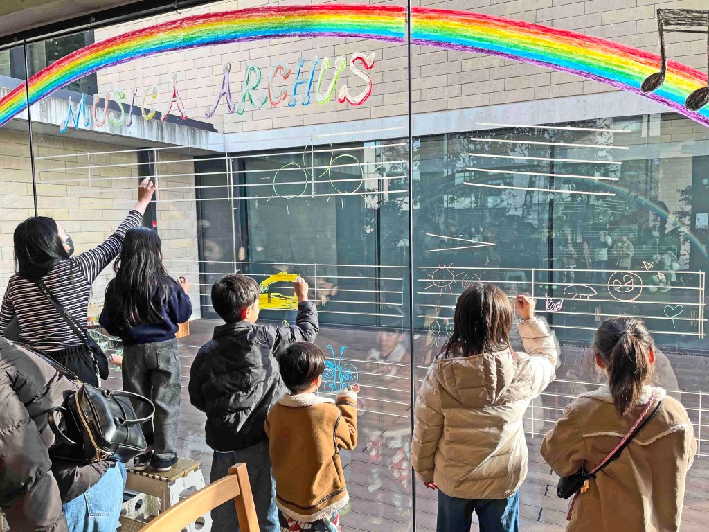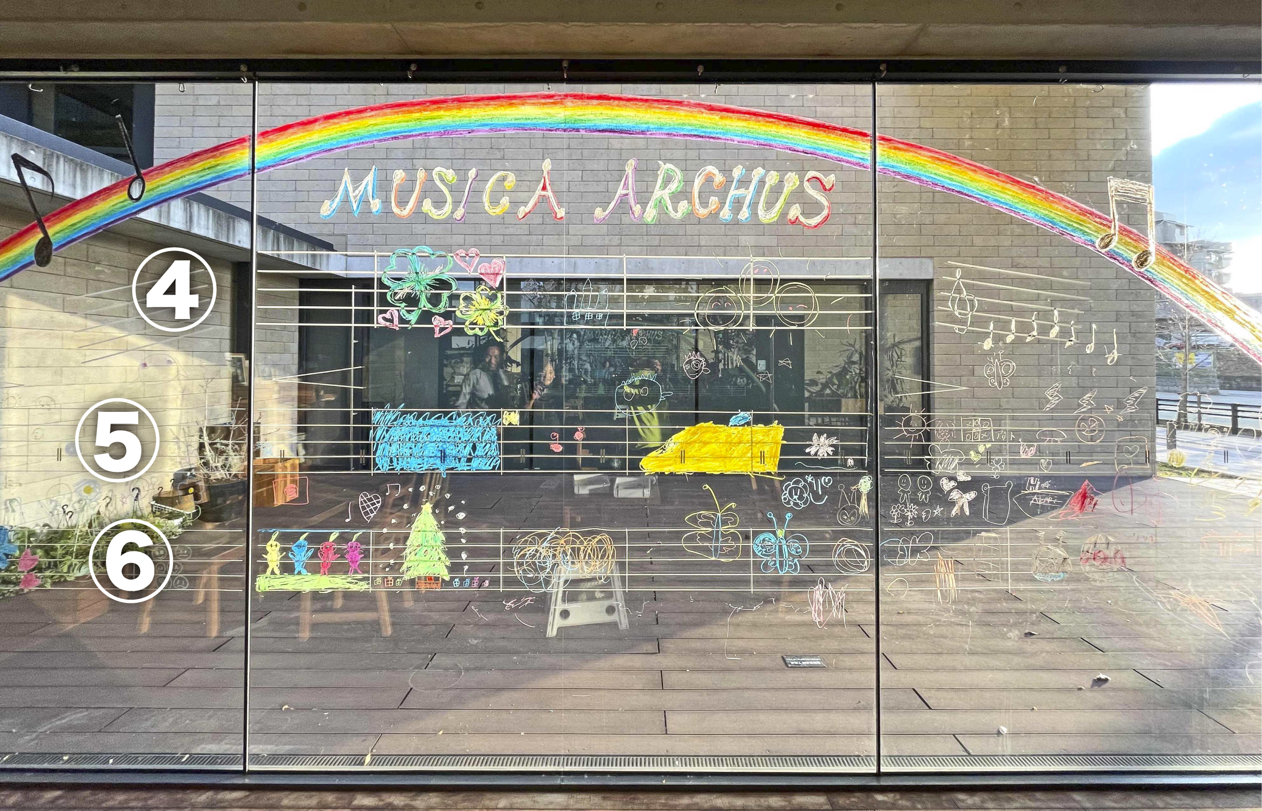 また、今回のマチなかコンチェルン♪のスペシャル企画として、2つの虹が出現したオリオンコーヒーのガラス面の五線譜にみんなでお絵描きをし、その描かれた“絵”をゲストのお二人が“音”として読み込み、即興の演奏会が繰り広げられました。