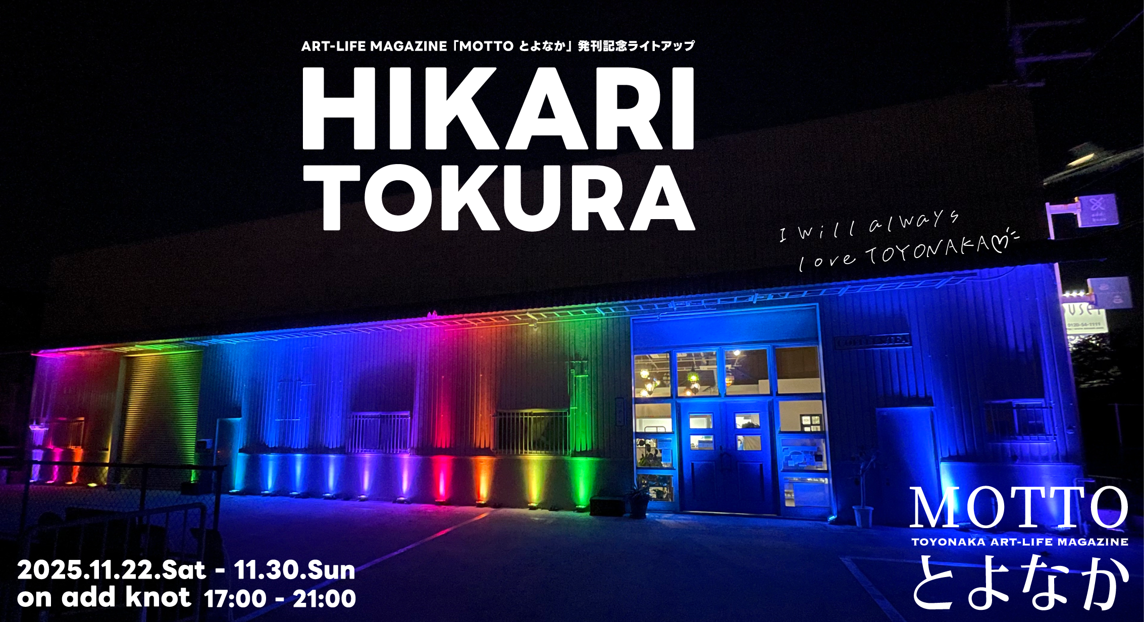 この度、「MOTTOとよなか」の発刊を記念して、豊中市東西エリアの西に位置する利倉地区にあり、TOYONAKA ART-BRIDGEのアート作品が設置されている店舗「add knot」の外観を虹色にライトアップいたします。