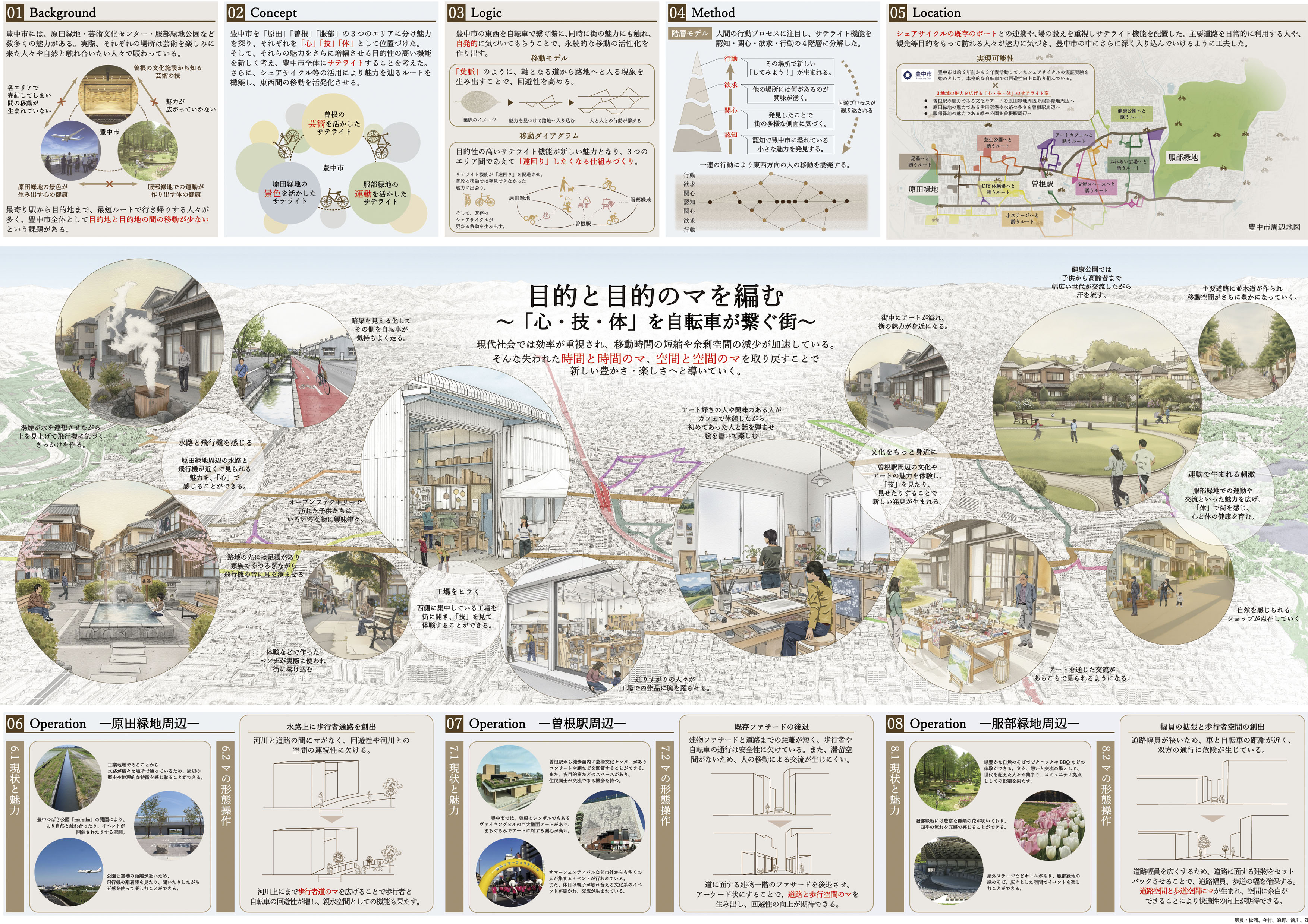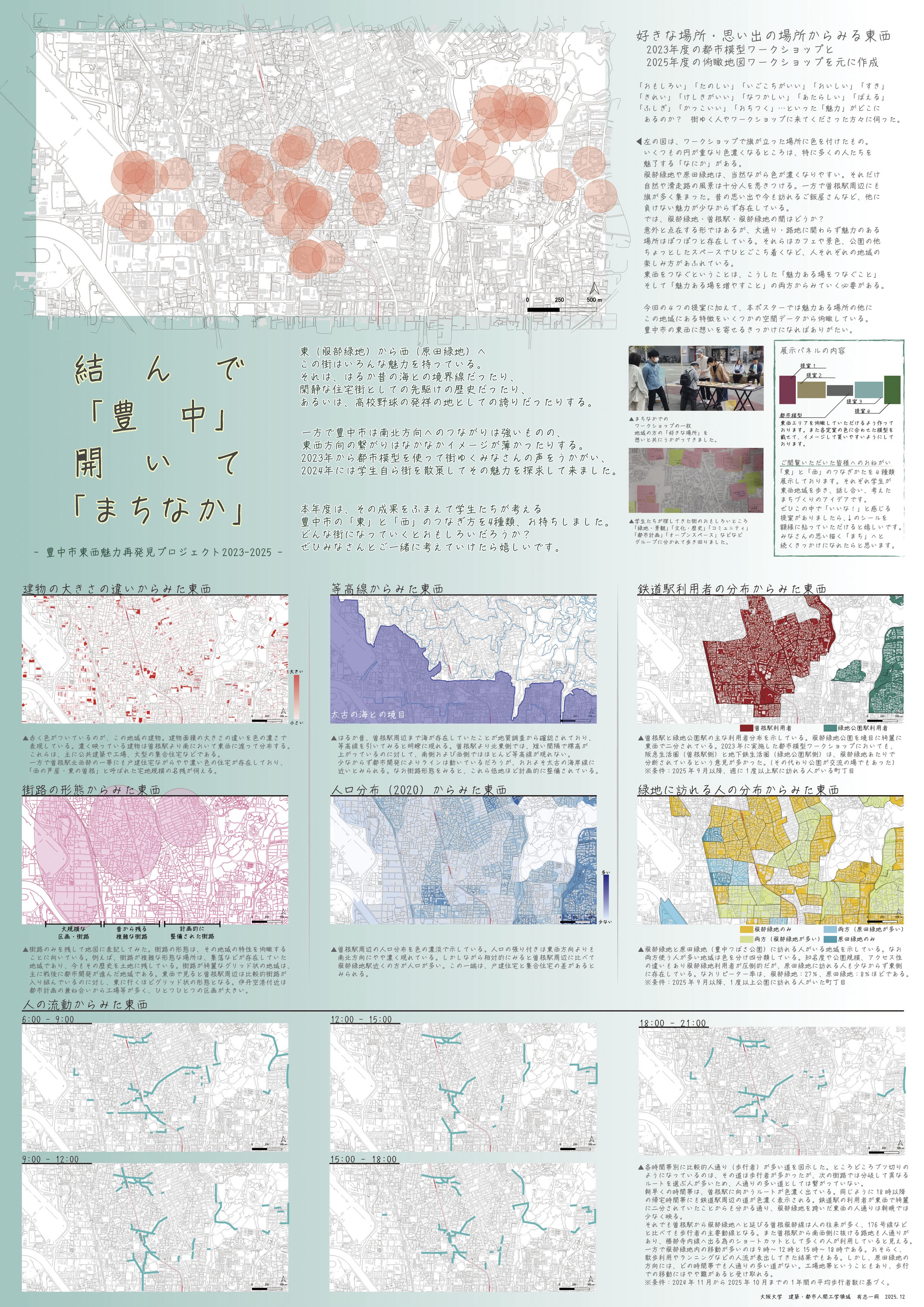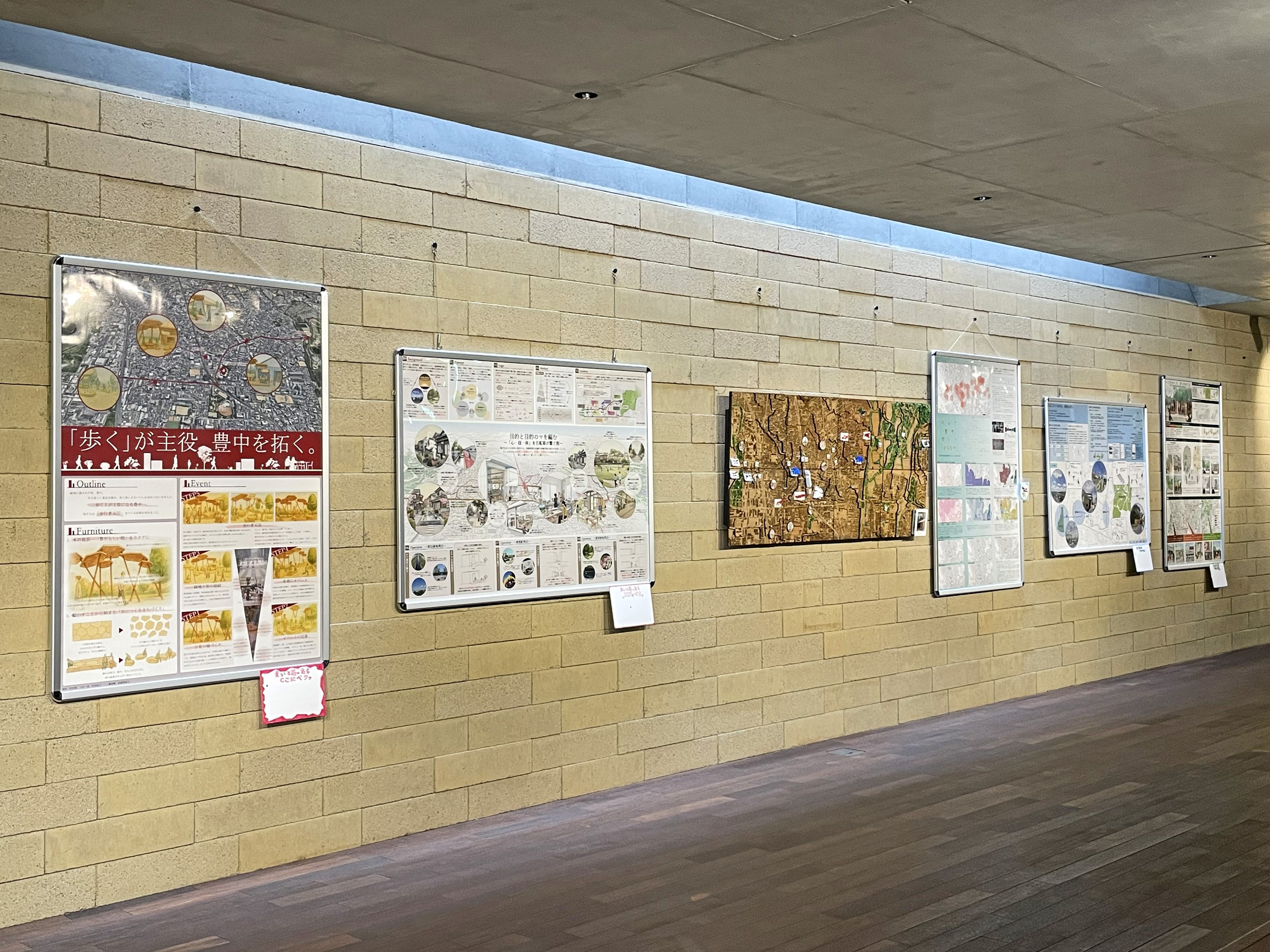 豊中市東西軸活性化事業が開始された2023年度より、教員と学生によるフィールドワークを開始し、この度その成果報告として、学生が描いた「未来の豊中東西」のイメージパネルがご覧いただけます。これまで研究に関わった学生は、大学院生、学部生合わせて27名にのぼり、人流データの分析や、東西エリアの模型を使った地域住民へのヒアリングをもとに、それぞれが考察をおこない、最終的には4グループによる「豊中東西の未来ビジョン」が示されています。