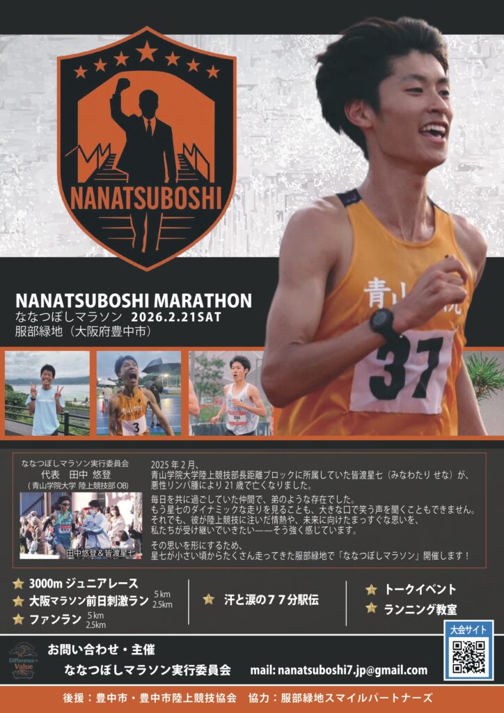 小学生の頃から練習や大会で走り続けた思い出の地、服部緑地を舞台に、彼を偲び、同じ景色・同じ空気を共有しながら多くの方が集い走る場として「ななつぼしマラソン」が開催されます。