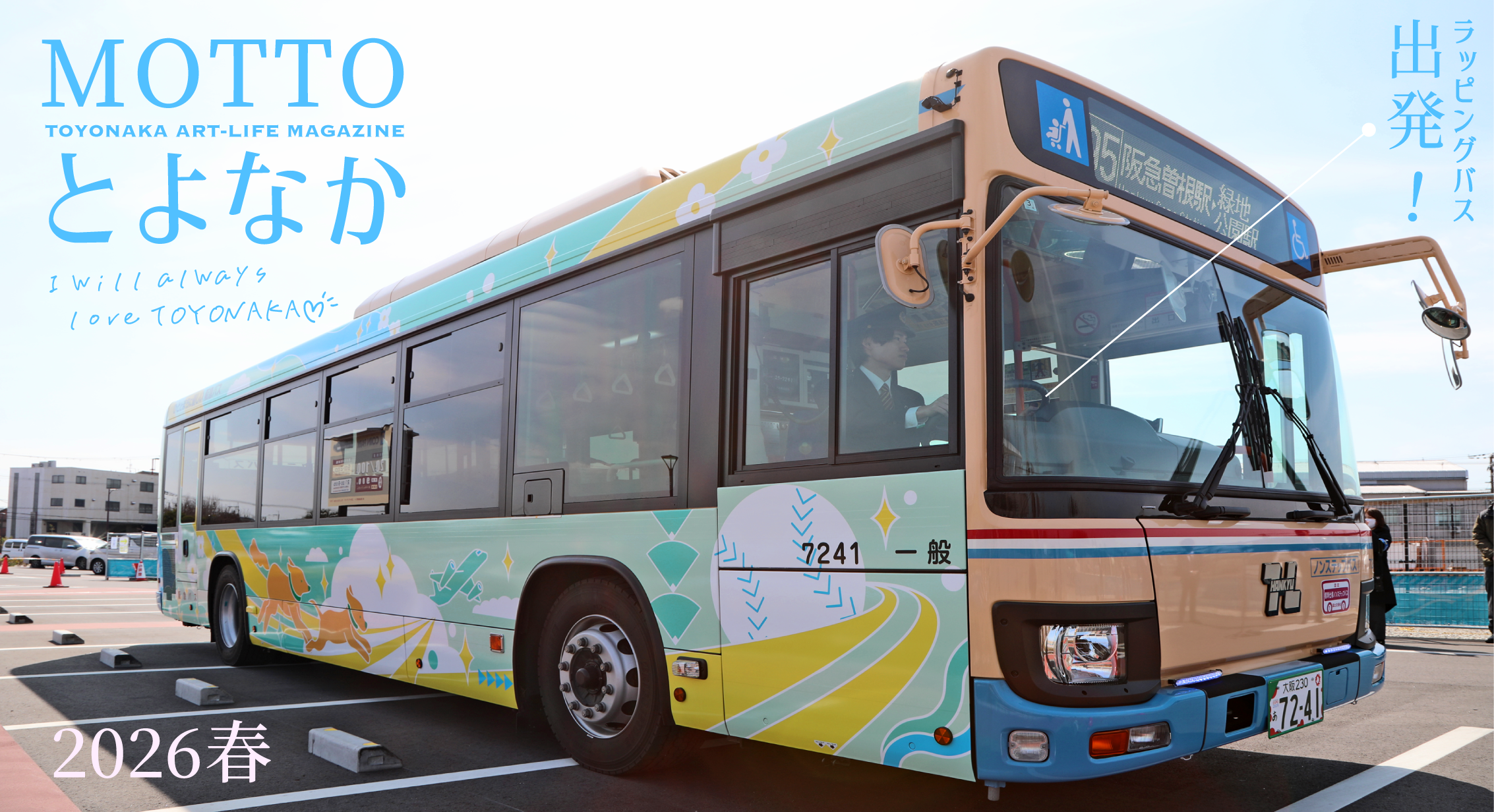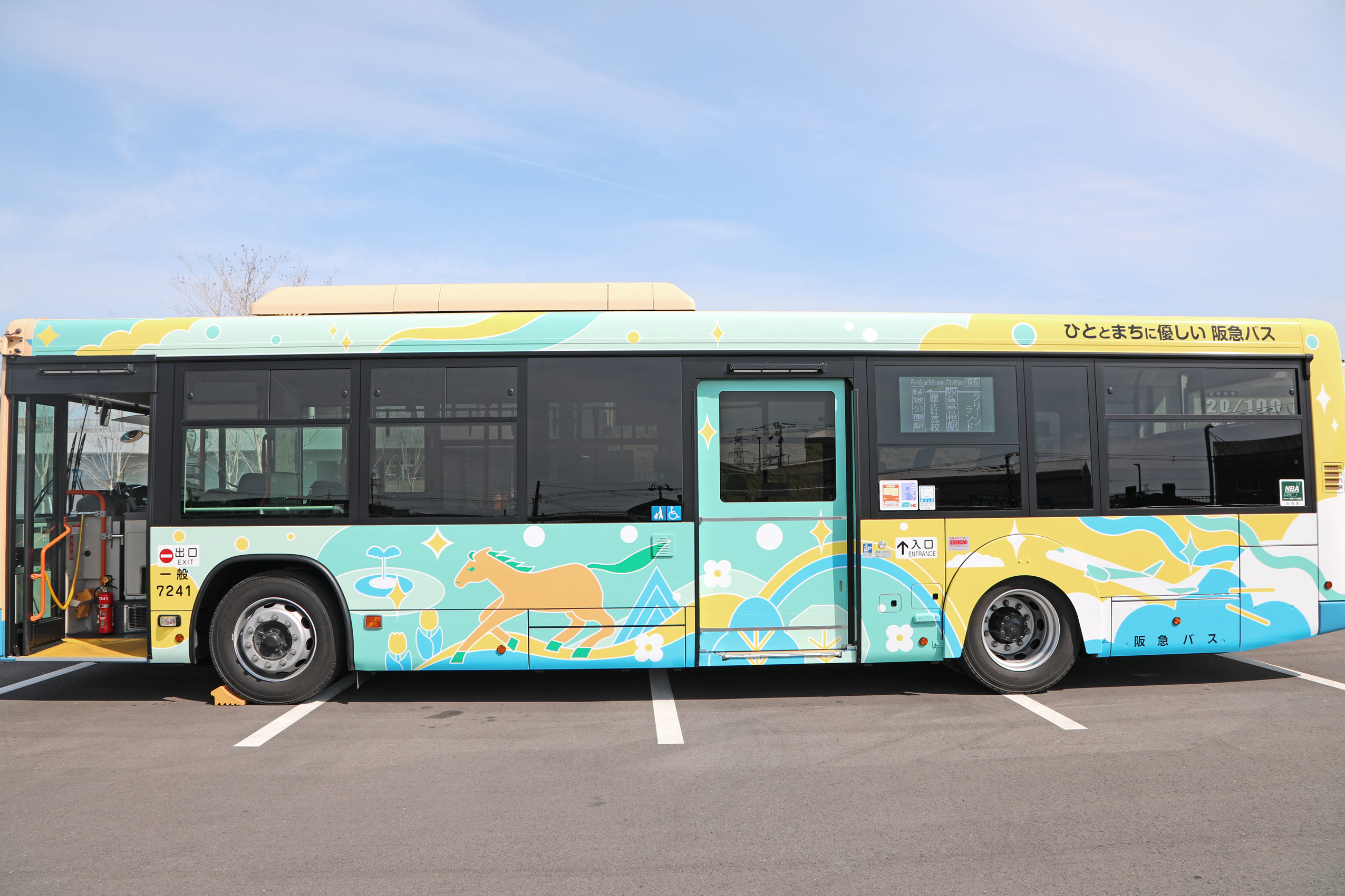 パステルブルーの親しみやすいポップなデザインの中に、豊中東西エリアのランドマークがレイアウトされ、両側面には、全体のまばゆい光の中を犬や馬が駆け抜ける姿もあり、見るものに優しい気持ちを抱かせる素敵な装いになっています。