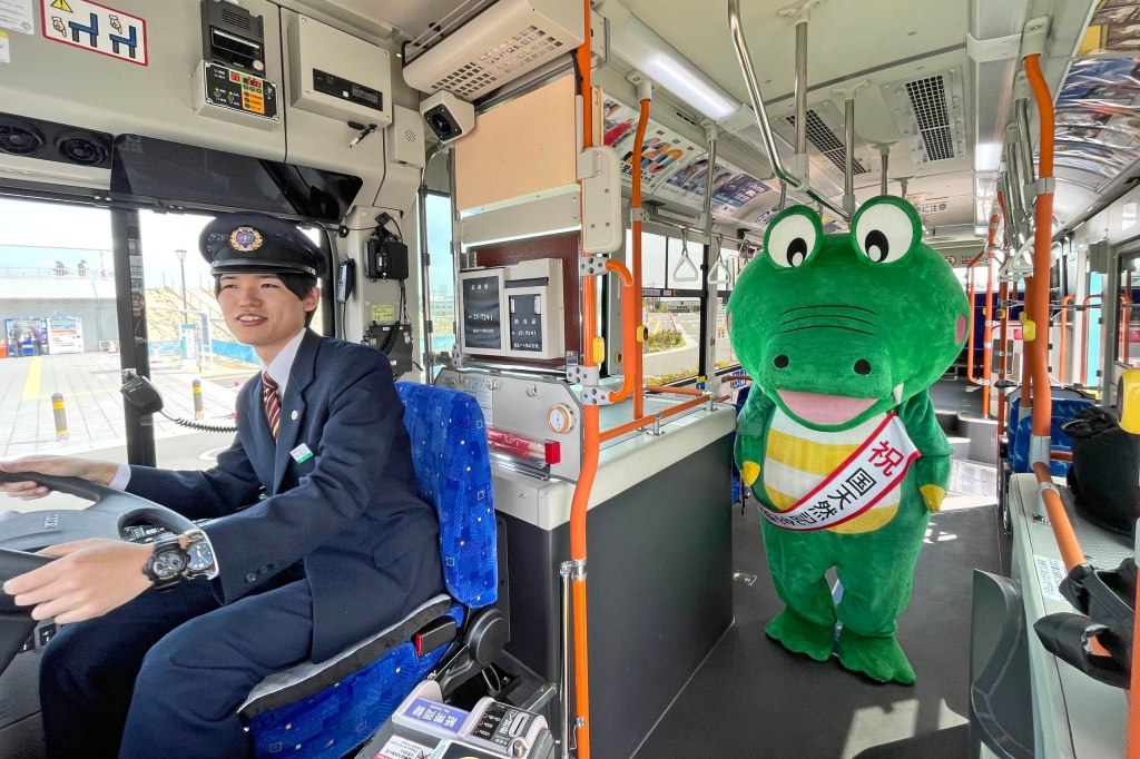 豊中市の長内繁樹市長、マチカネくんと共に撮影会も催され、第一号の乗客はマチカネくん!