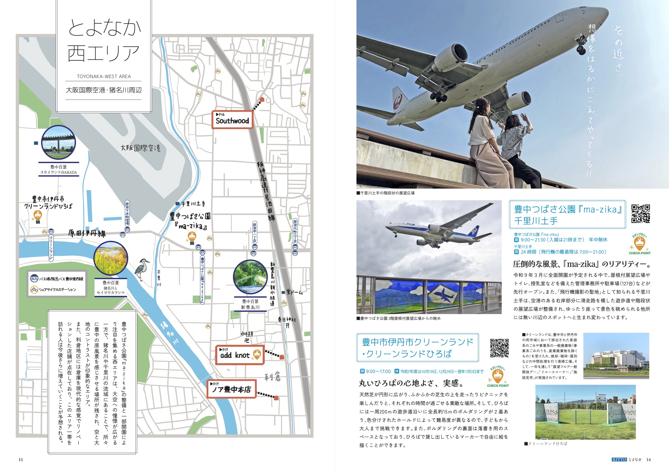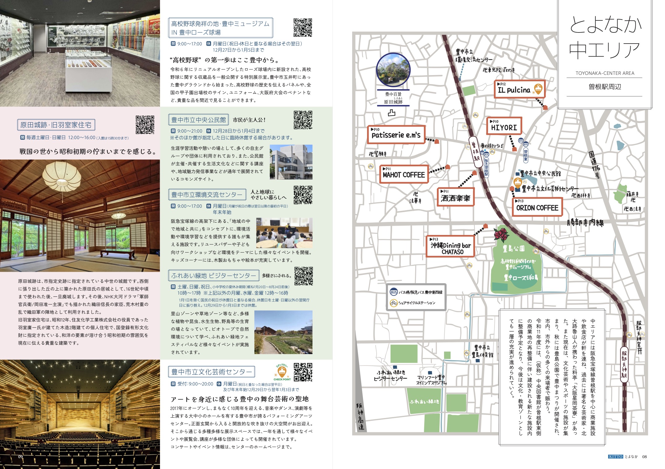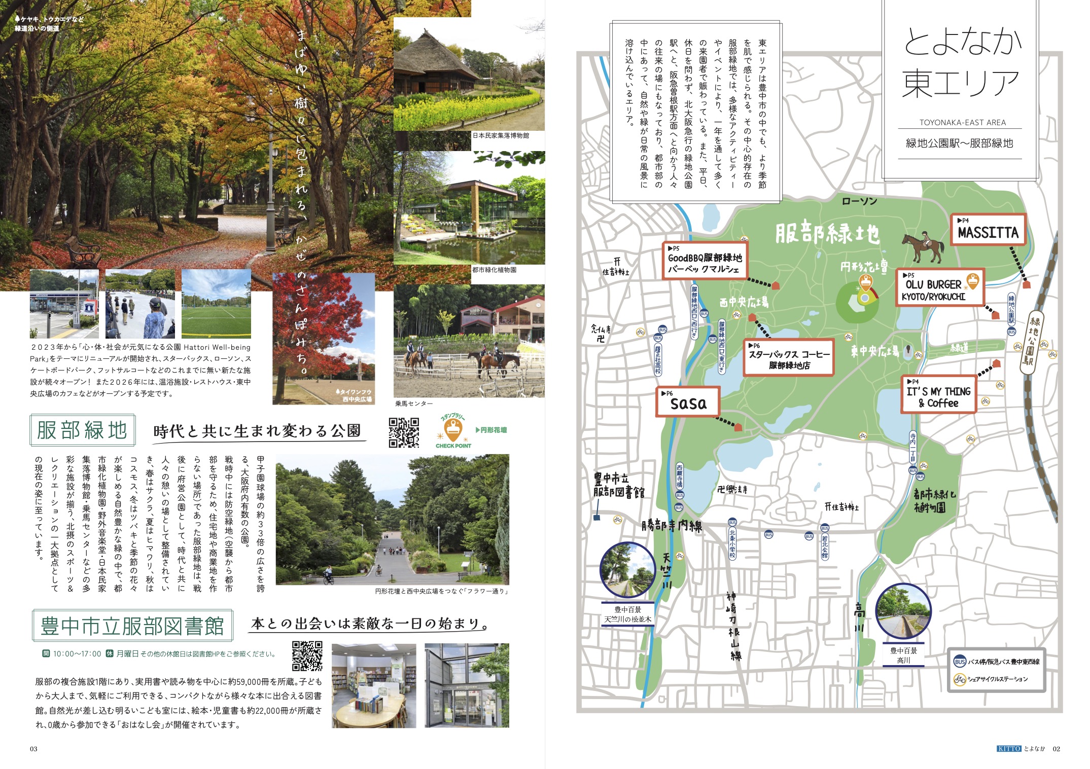 豊中市東西軸の3エリア(東、中、西)に分け、各エリアの施設やスポット、オススメの飲食店、アート作品を紹介。
