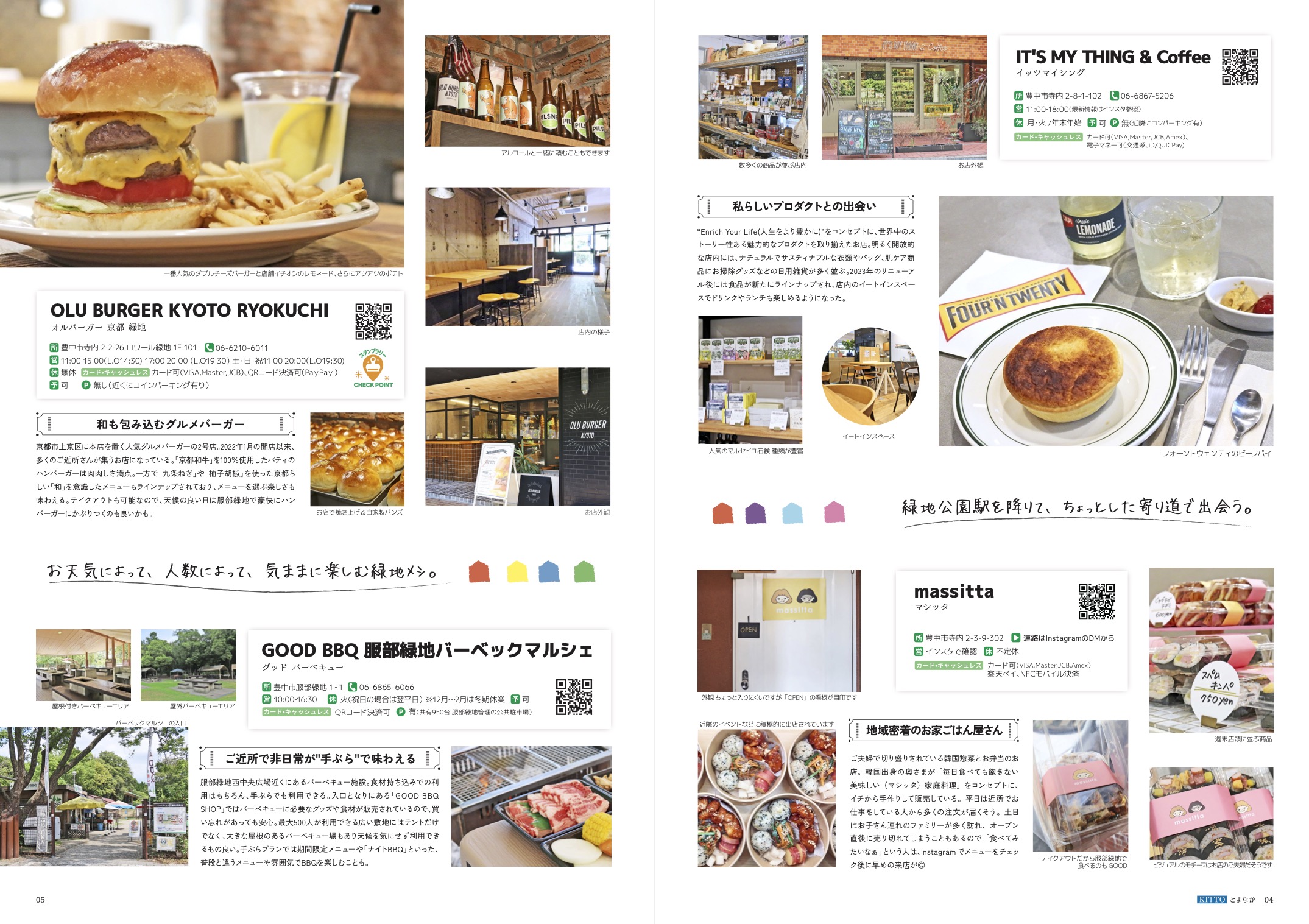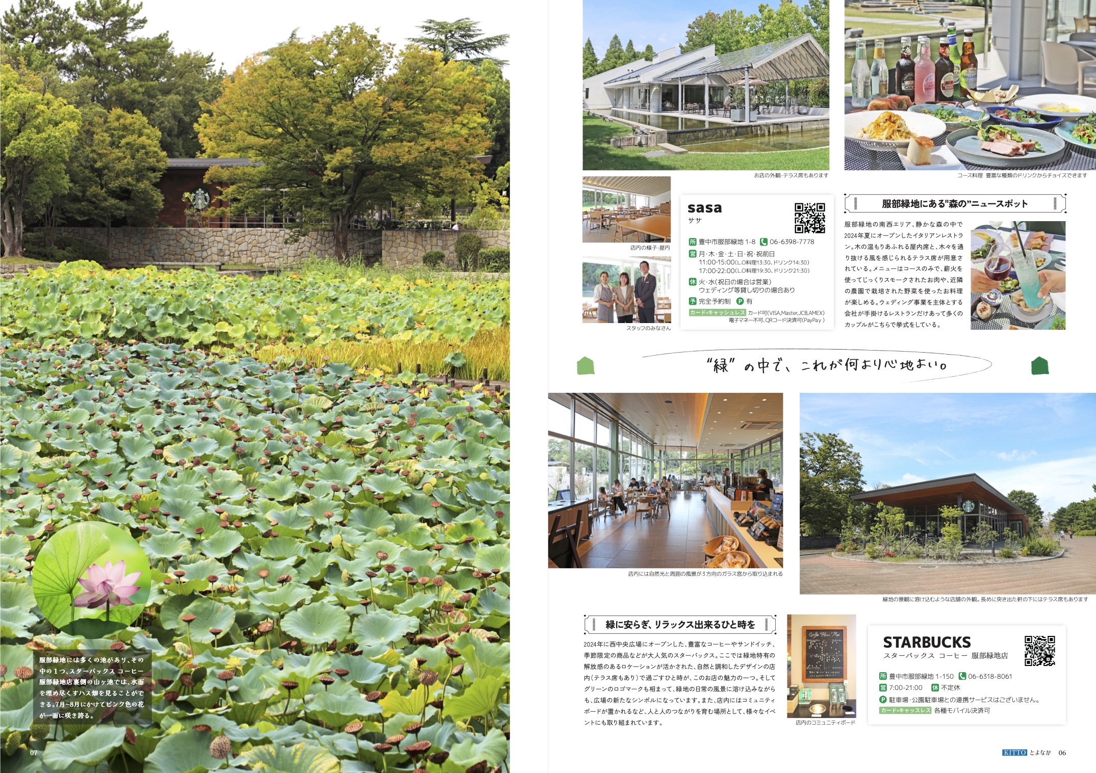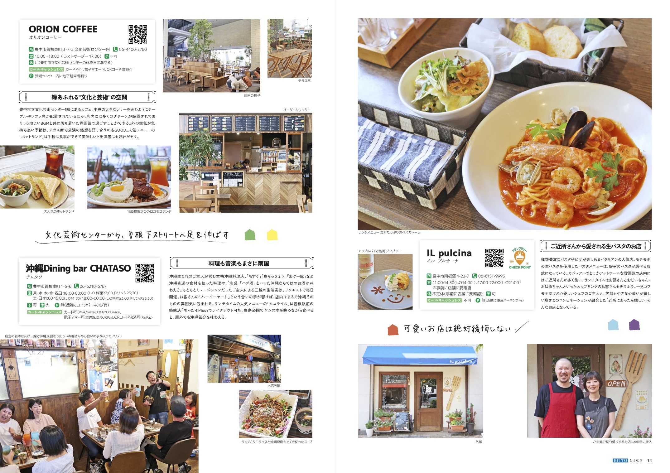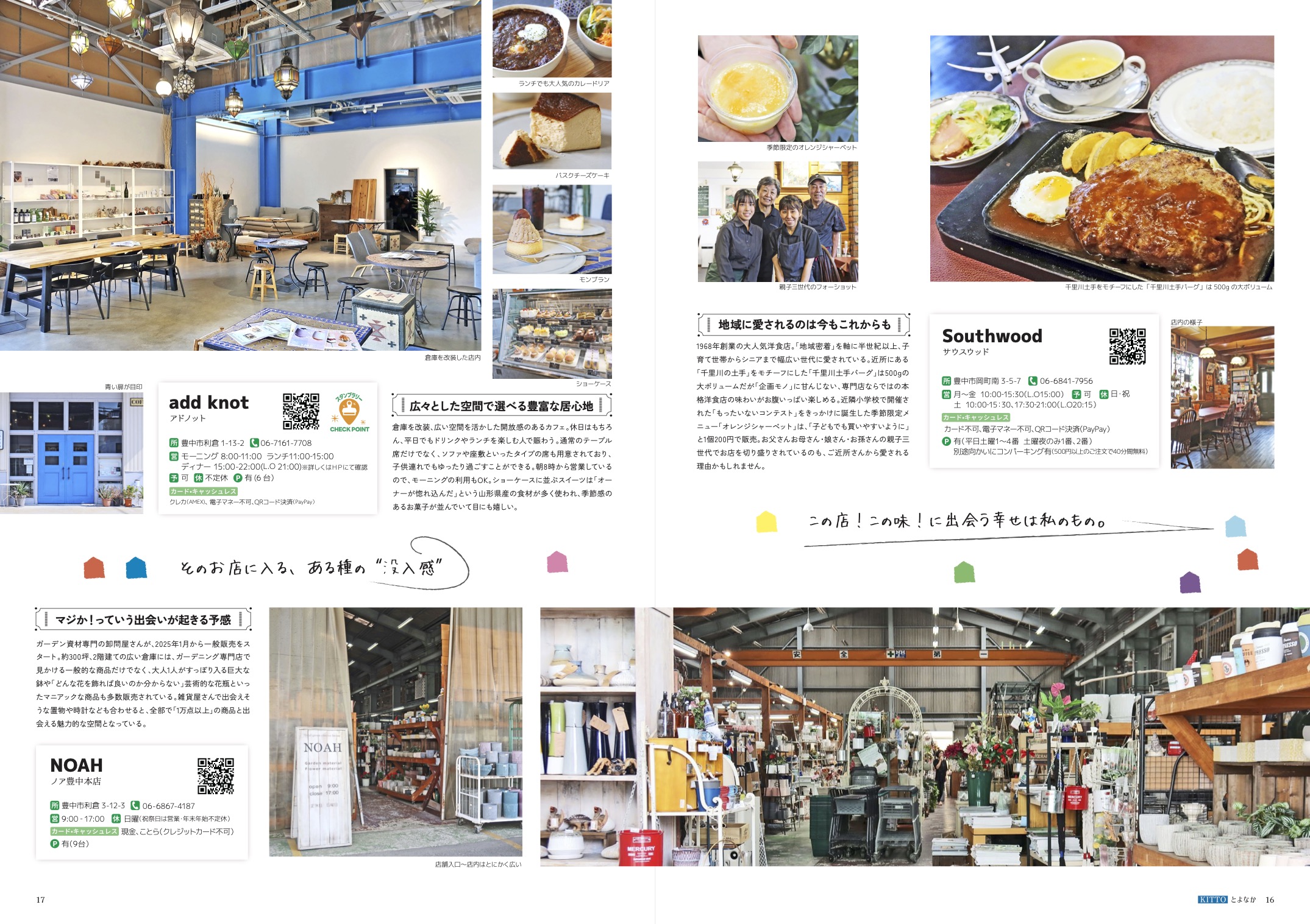 豊中市東西軸の3エリア(東、中、西)に分け、各エリアの施設やスポット、オススメの飲食店、アート作品を紹介。